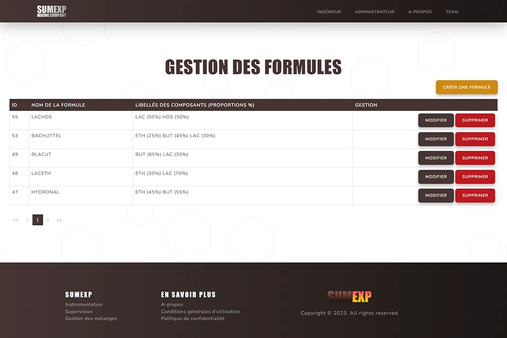 Ce site a pour but de pouvoir gérer les différentes recettes de mélanges chimiques, les différentes formules et composants associés, les différentes actions réalisables par la machine, ainsi que la création d'ordre de mélanges et la visualisation des logs de mélanges.