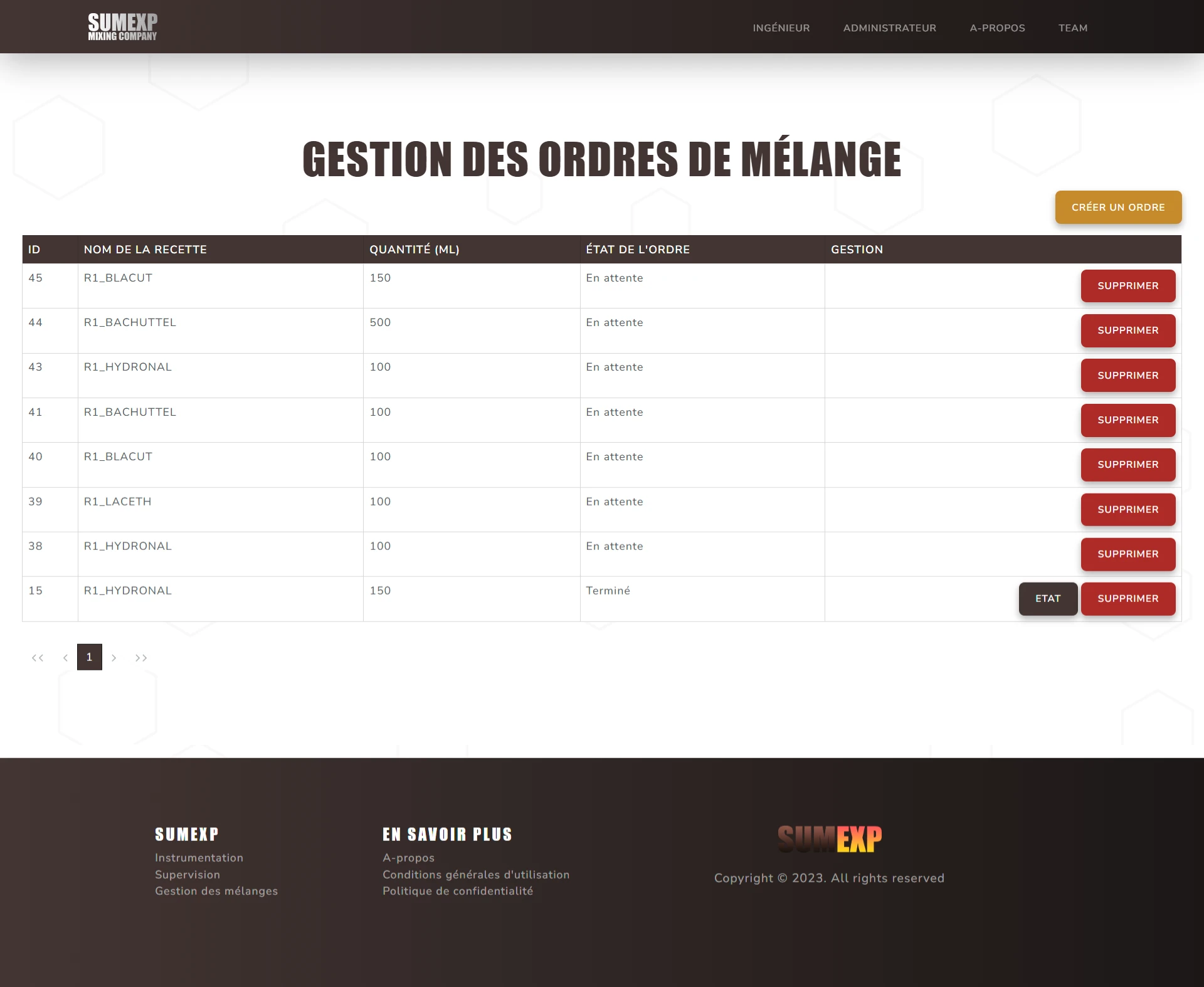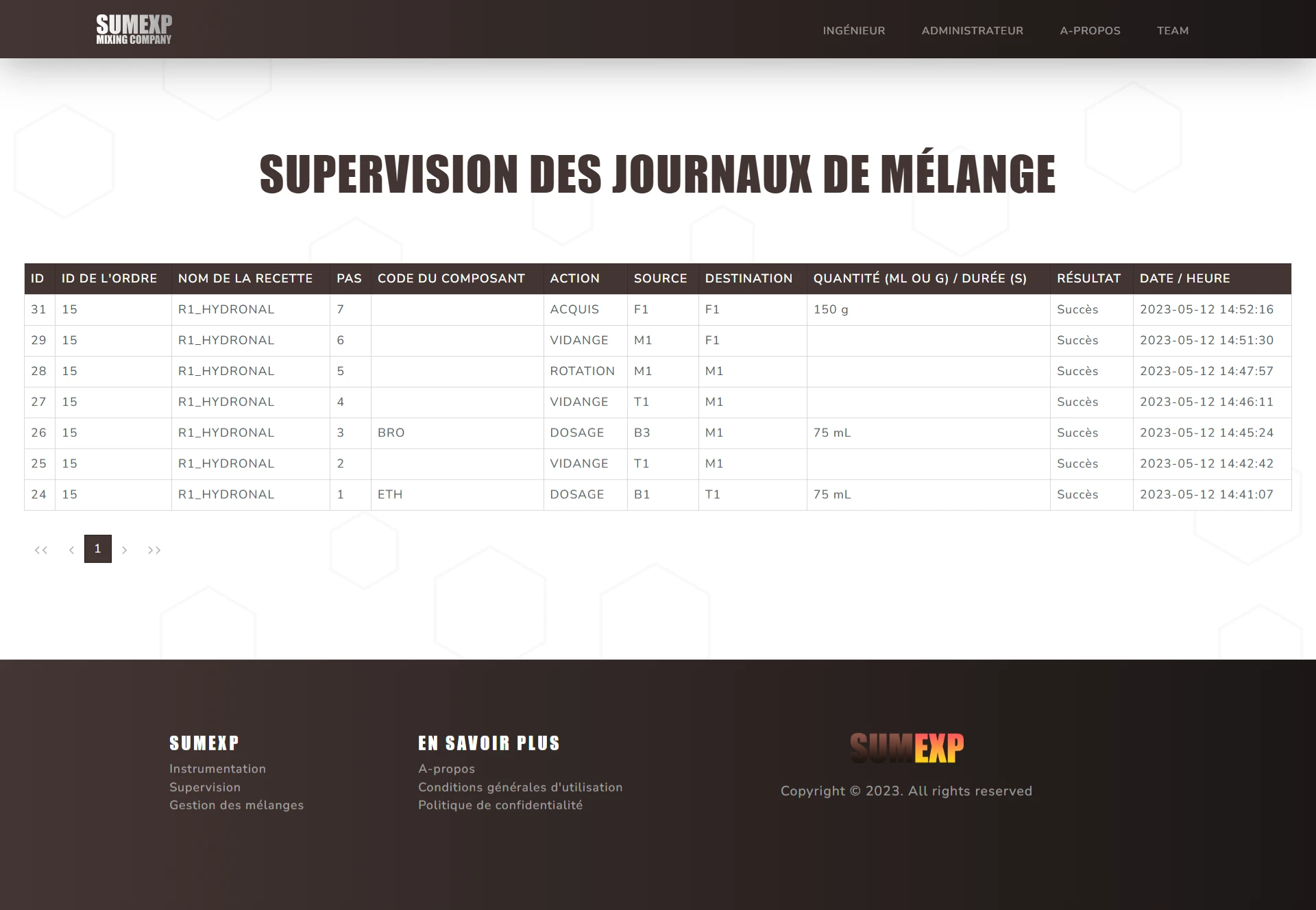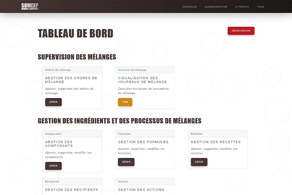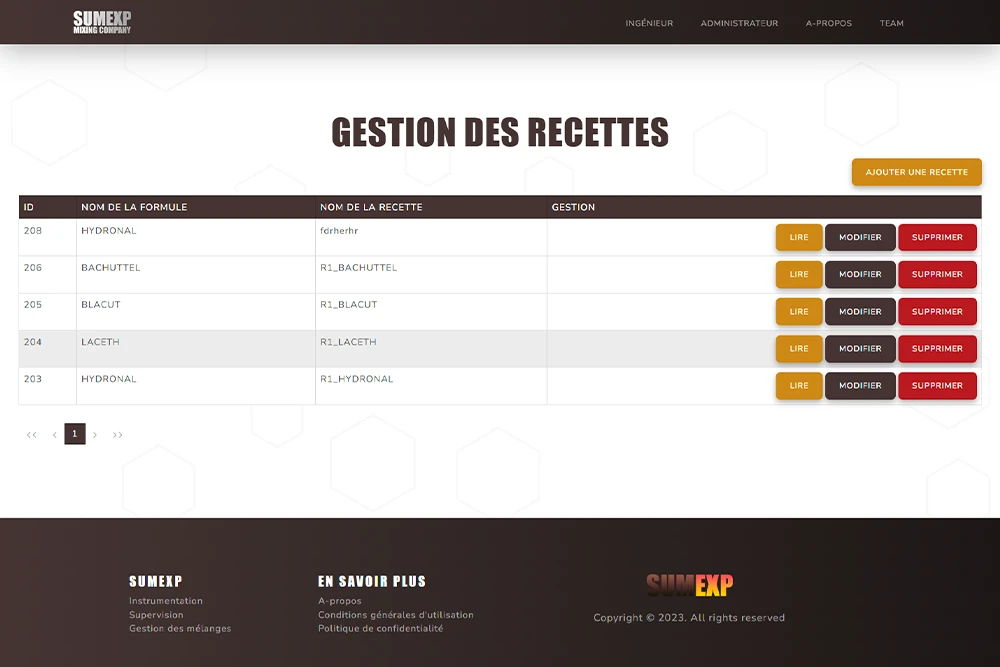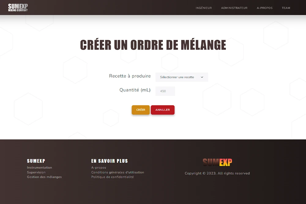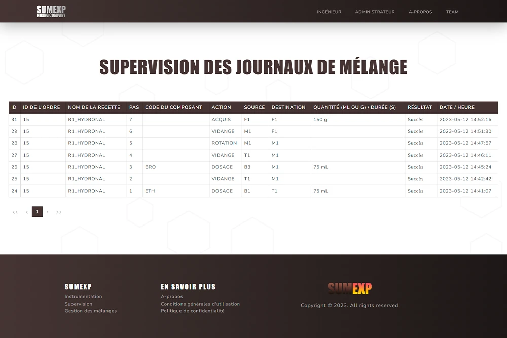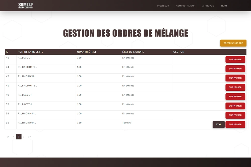 Ce site a pour but de pouvoir gérer les différentes recettes de mélanges chimiques, les différentes formules et composants associés, les différentes actions réalisables par la machine, ainsi que la création d'ordre de mélanges et la visualisation des logs de mélanges.