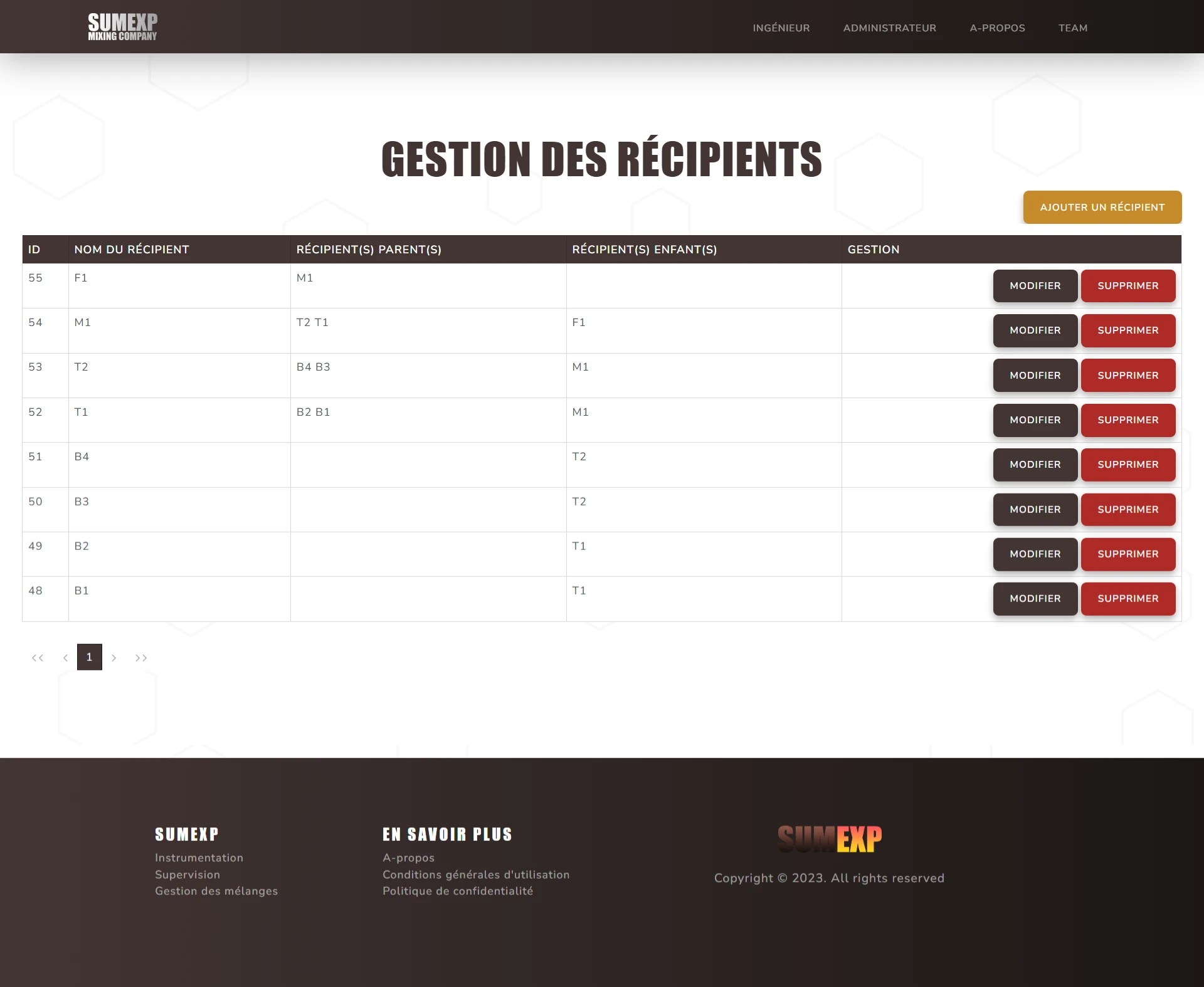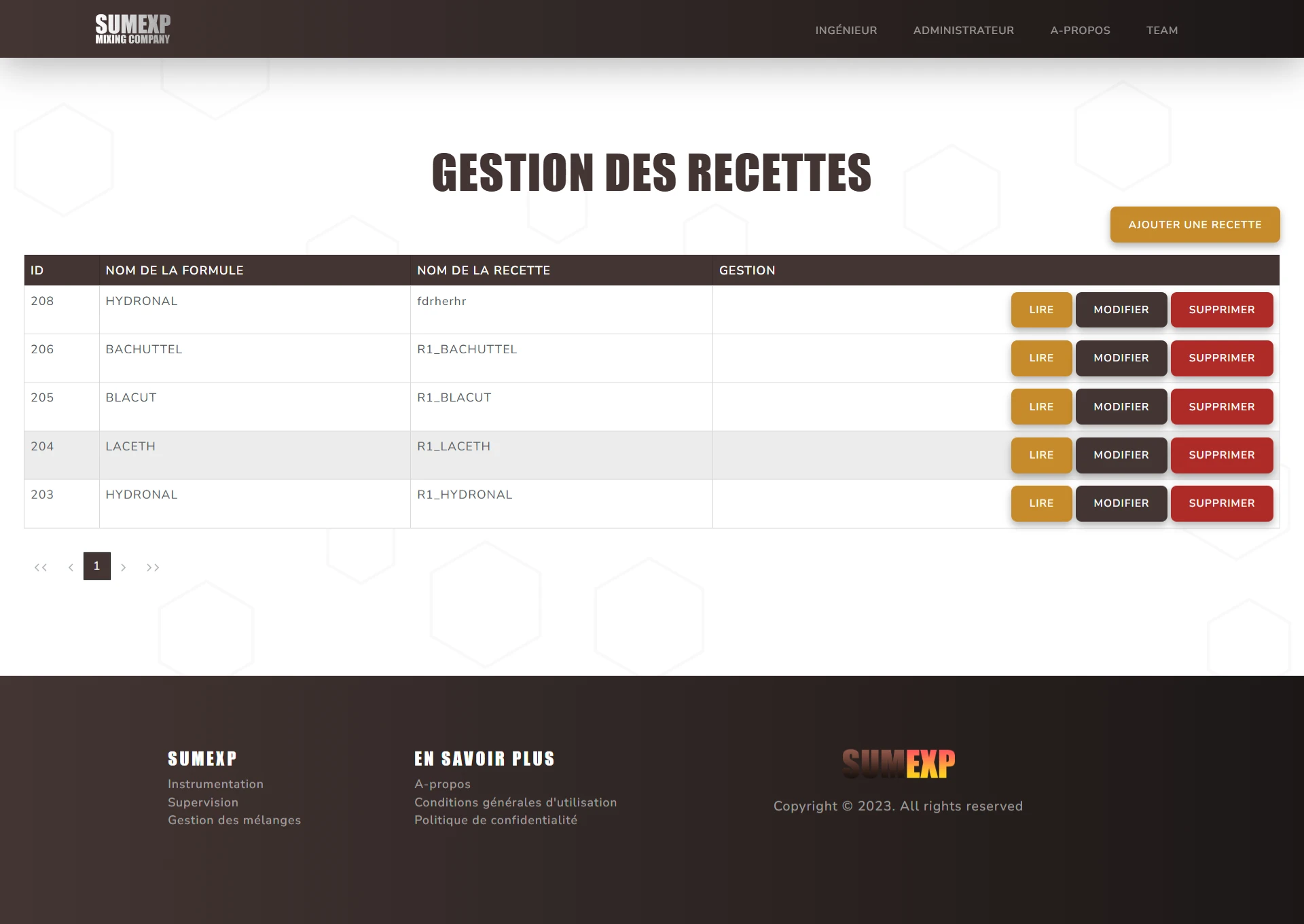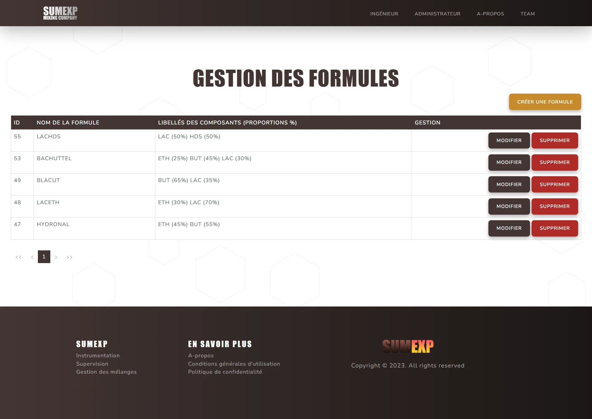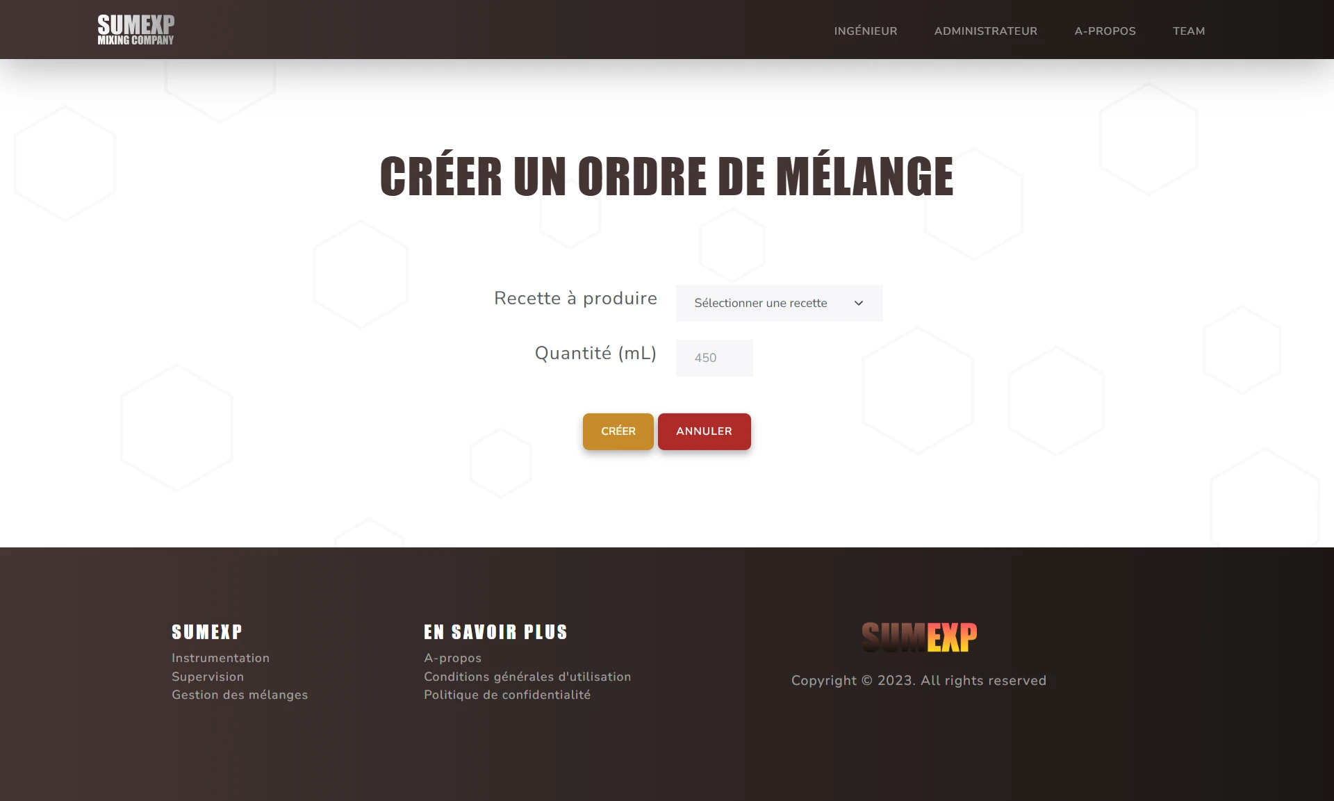 Ce site a pour but de pouvoir gérer les différentes recettes de mélanges chimiques, les différentes formules et composants associés, les différentes actions réalisables par la machine, ainsi que la création d'ordre de mélanges et la visualisation des logs de mélanges.